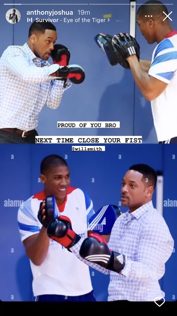 "Гордея се с теб, братле. Но следващия път свий юмрука", написа Джошуа на "стори" в Instagram, използвайки общи снимки със Смит, за да превърне публикацията си в поредното "меме", посветено на плесника.