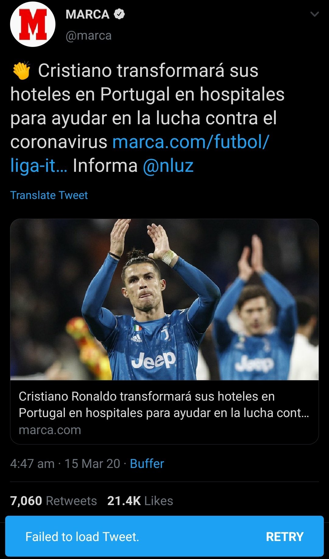 В социалните мрежи от 24 часа тргъгна слух, че суперзвездата на Ювентус и Португалия Кристиано Роналдо е направил безпрецедентен жест към сънародниците си. Твърдеше се, че нападателят е предоставил на властите хотелите си в Португалия, за да се превърнат в болници, където да се лекуват хората, заразени с коронавирус, съобщава "Marca".